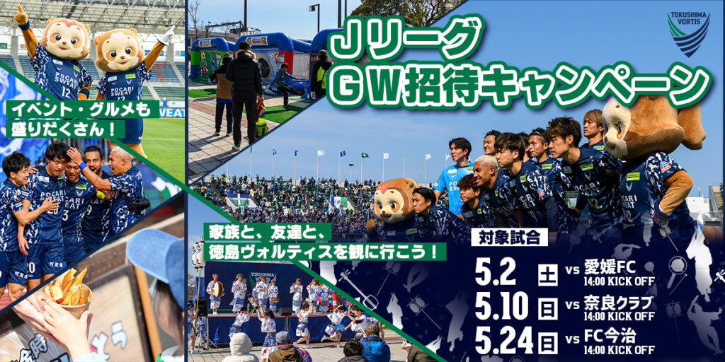 徳島ヴォルティスでは、5月2日(土)愛媛戦、5月10日(日)奈良戦、5月24日(日)今治戦の3試合を対象に抽選でご招待します!