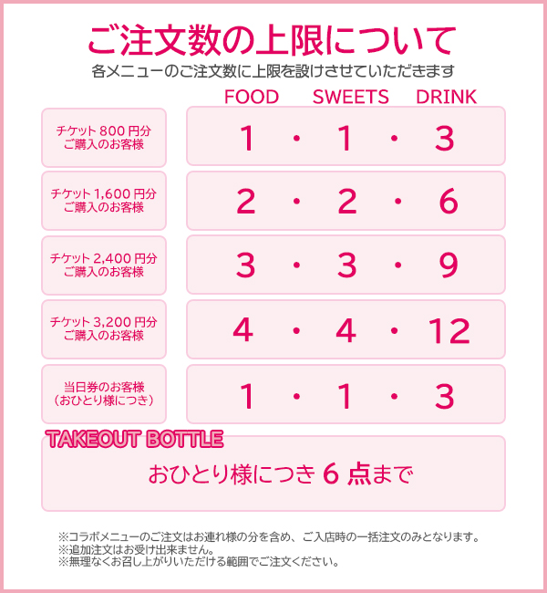 ※ご予約時間(入店時間)から30分過ぎてもご来店がない場合はキャンセル扱いとなり、ご入店いただけません。お食事クーポンの利用、グッズのご購入もお受けできかねますのであらかじめご了承ください。また、当日席へのご案内可能時間に関しましても各回の入店時間から30分後までとなります。