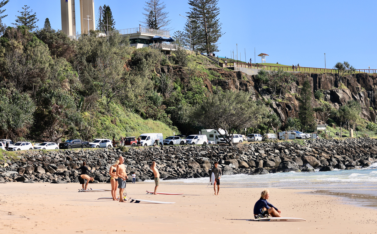 サーフィン目的だけでなく、多くの人が集まるレインボーベイのビーチ。白い砂浜が広がり、1年を通してライフガードが監視している安全な浅瀬の海水浴エリアは人気のスポットの一つ。