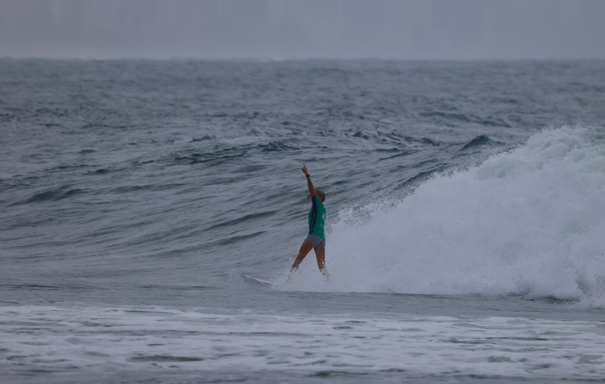 最後にドラマを作った、バイロンベイ・ボードライダーズのダコダ・ウォルターズ。残り時間5分ほどでスタート地点から全力で走り、岩ゲットを経て、すぐさま沖に到達し、セットの波でエクセレントスコアをゲット。まさにフリーサーフィンで養われた本能というべきか、人間離れした事をやってのけた。
