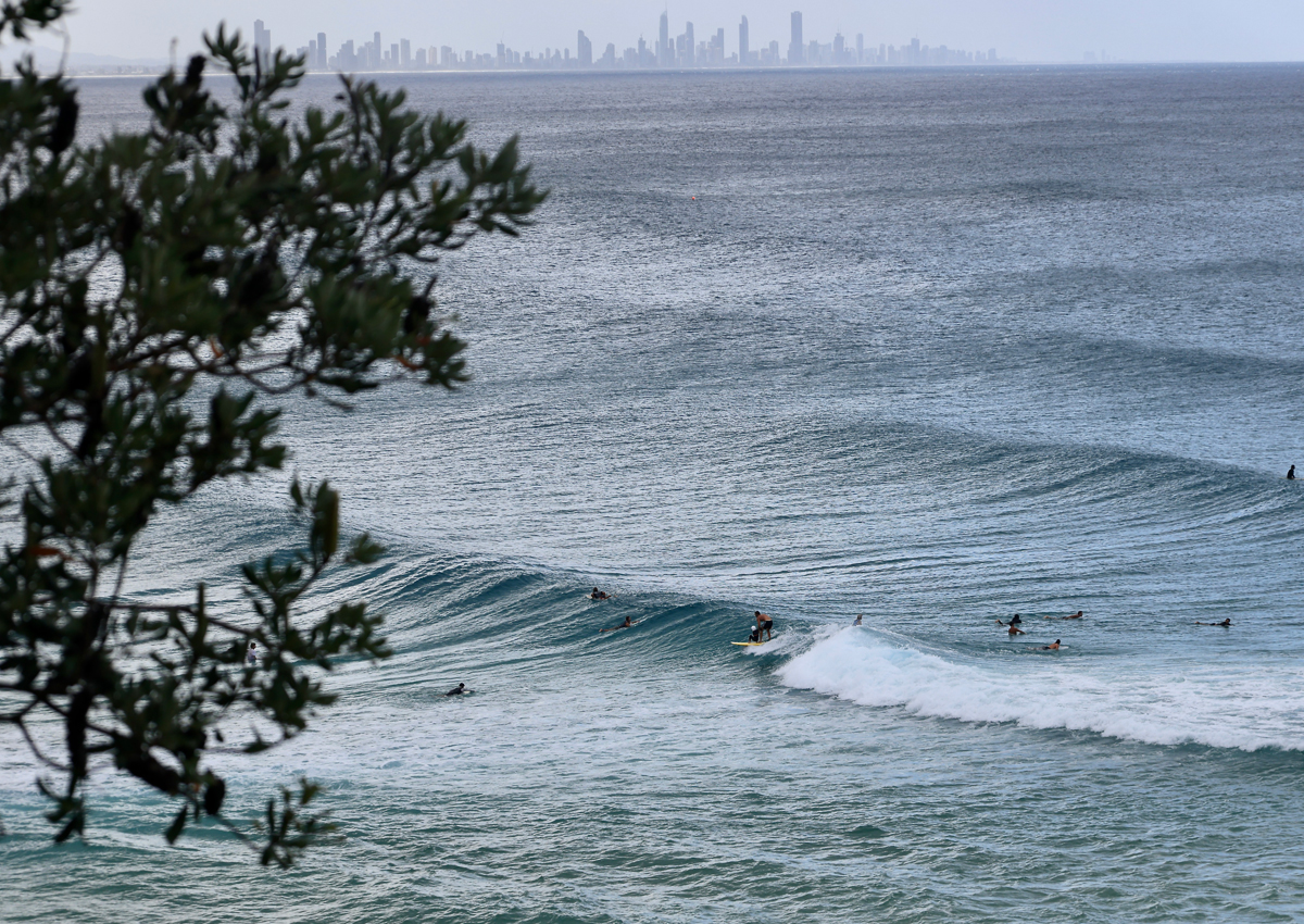 スナッパーロックスのピークと比べると比較的レベルも高くなく、乗りやすい波がブレイクするグリーンマウント。子供とタンデムしながらクルーズしている姿も。