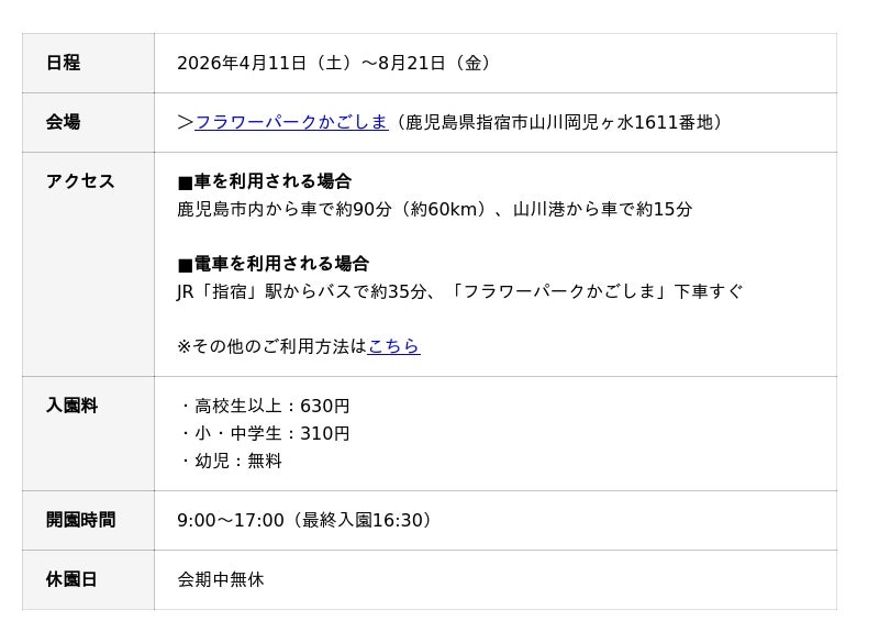 会場となるフラワーパークかごしま(鹿児島県指宿市)は、温暖な気候を活かした世界各地の植物が楽しめる公園です。36.5 haもの広大な敷地には、さまざまな花や植物をはじめ、光・風・緑の空間を楽しめるエリアのほか、屋内庭園や温室など多彩な施設が備わっています。