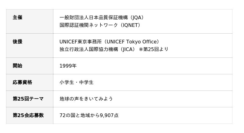 「JQA地球環境世界児童画コンテスト」は、子どもたちに絵を描くことを通じて環境問題について考える機会を提供することを目的に、UNICEF東京事務所(東京都渋谷区)と独立行政法人国際協力機構(東京都千代田区、略称:JICA)の後援(※)のもと1999年より毎年開催しています。また、国内の美術館などで展示会を開催し、多くの人たちに子どもたちの地球環境へのメッセージを伝えています。