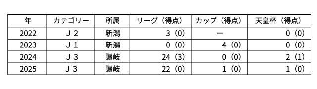 J3リーグ通算:46試合出場3得点、カップ戦通算:5試合出場0得点
