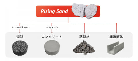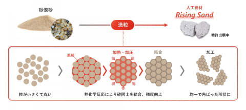 Rising Sandは、こうした課題の解決に向けて開発された人工骨材。100μm程度の微細な球状の砂漠の砂を、独自の造粒技術により数十mm単位の粒径に加工し、粒度や形状のばらつきを抑えて骨材としての強度を高めることで、高い経済性と耐久性を両立する。