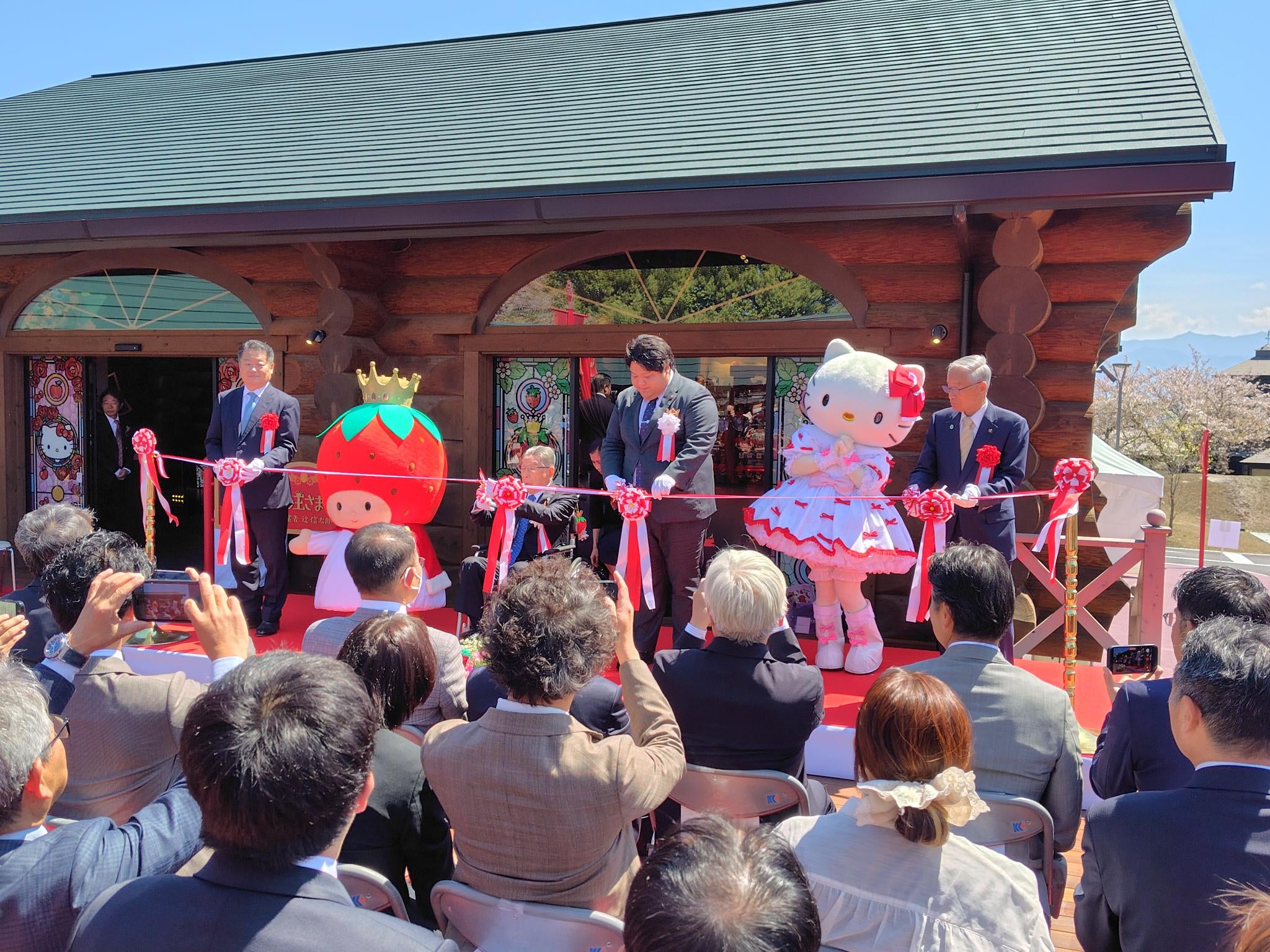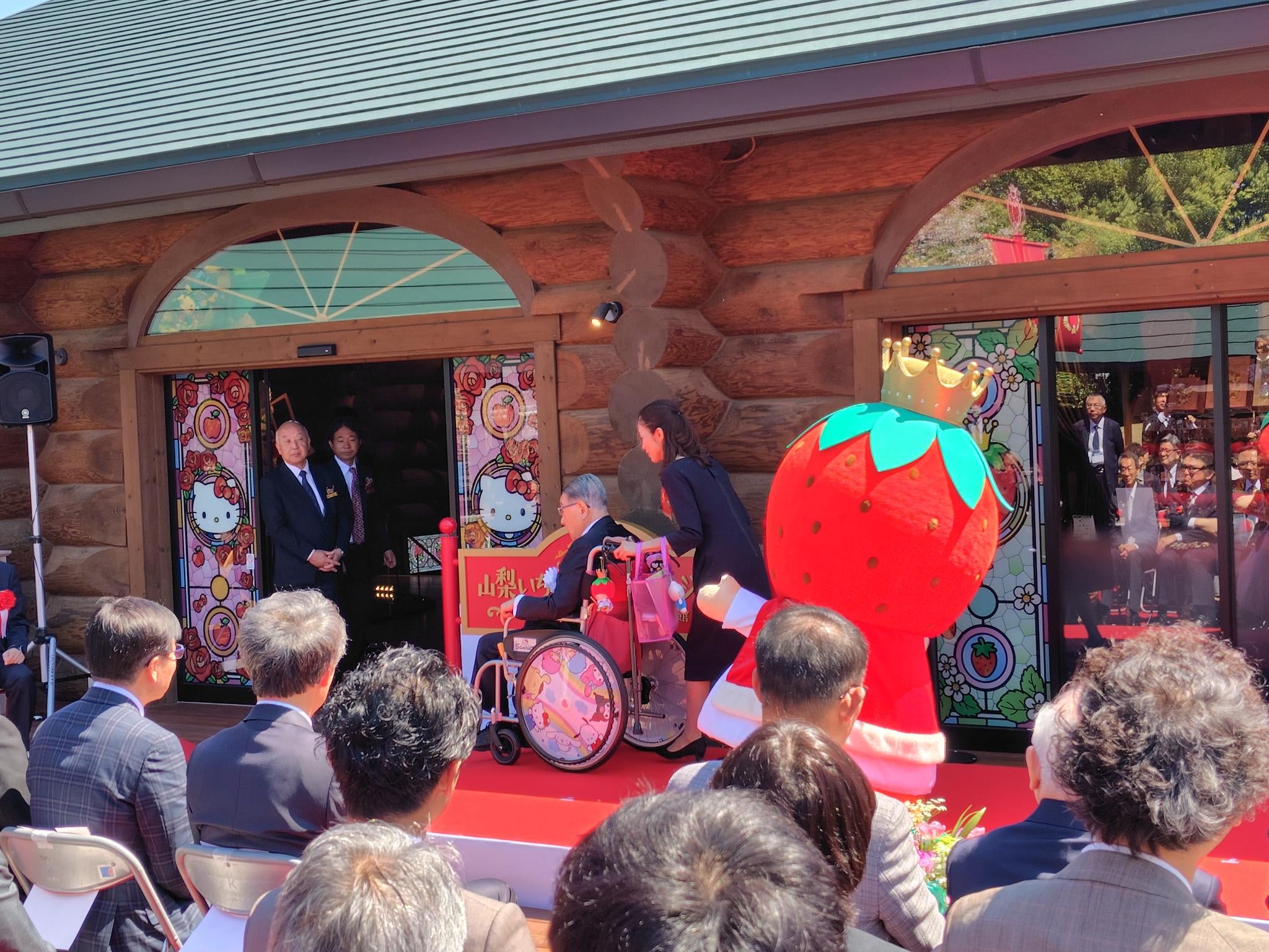 セレモニーでは辻󠄀信太郎さんが車いすで登壇。「甲府の空襲は大変なことでした。そこで感じたのが、人は一人では生きていけないんだ、みんな仲良くしていこうということです。1960年に作ったサンリオの歴史に興味のある人が訪れてくれるといいなと思います」と語りました。山梨県の長崎幸太郎知事も列席して、「私も小さいときにキティちゃんのノベルティグッズを売っている店に行くのが楽しみでした。ここでオブジェを見て子供の頃の気持ちを思い出しました。県外からお客さんを呼び込んでください」と祝辞を述べました。