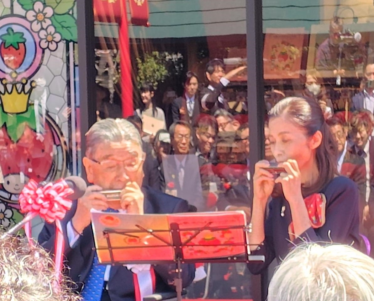 ハーモニカ演奏を披露する辻󠄀信太郎さん(左)