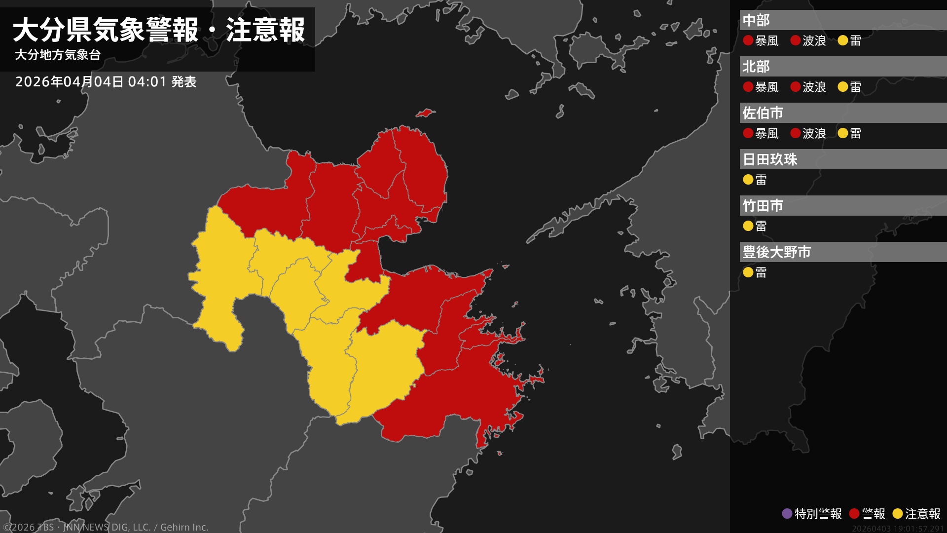 【暴風警報】大分県・大分市、別府市、中津市、佐伯市、臼杵市、津久見市などに発表 4日04:01時点