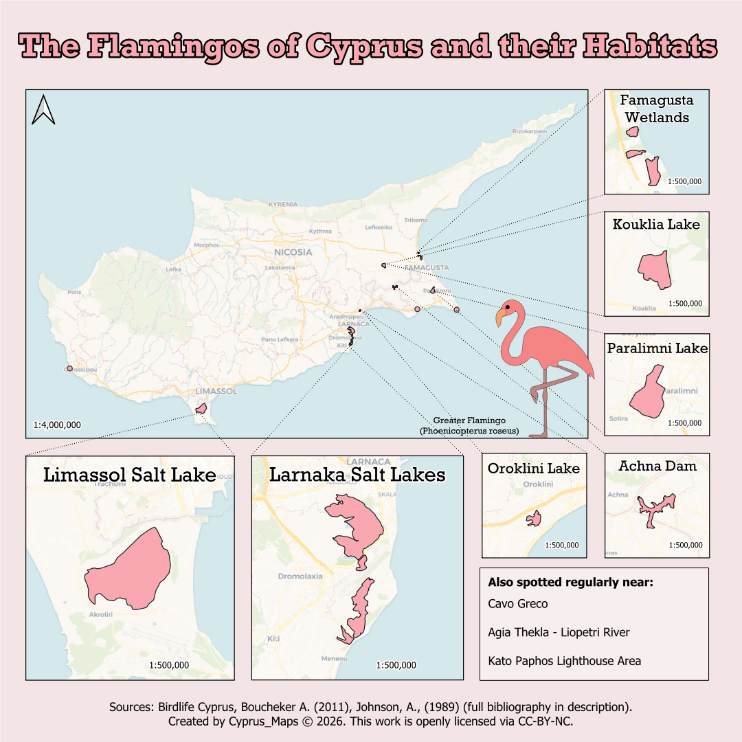 私は、フラミンゴがキプロスへ冬に移動する間にキプロスで見られるすべての場所を示すこの地図を作成しました。