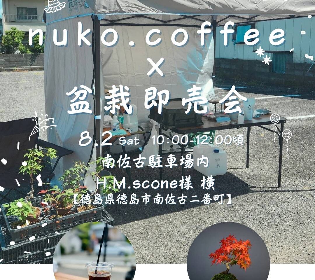 【徳島市】緊急朗報♪コーヒーと盆栽の販売イベント「nuko.coffee × 盆栽即売会」が明日8月2日(土)開催予定との情報をお寄せいただきました!
