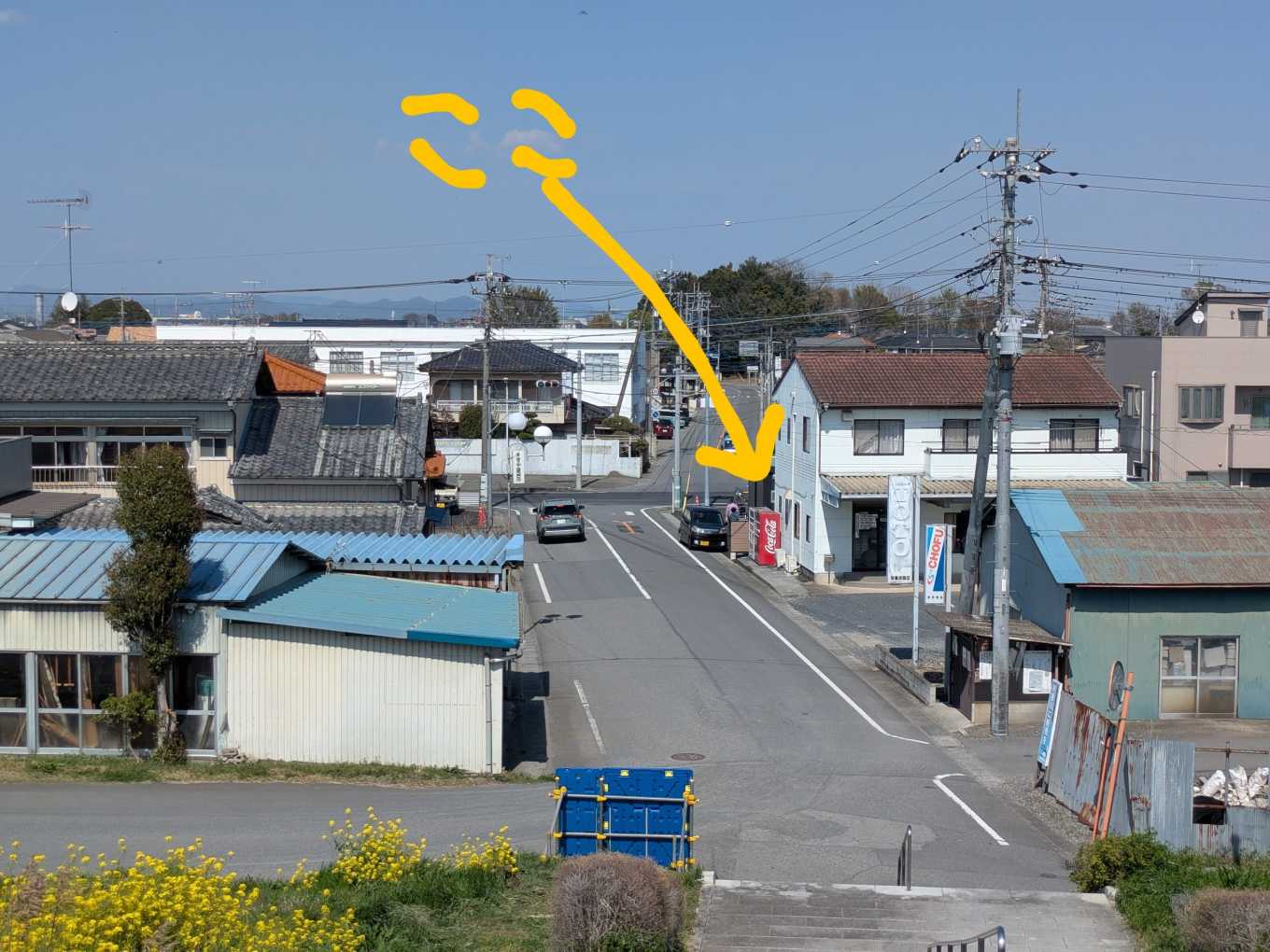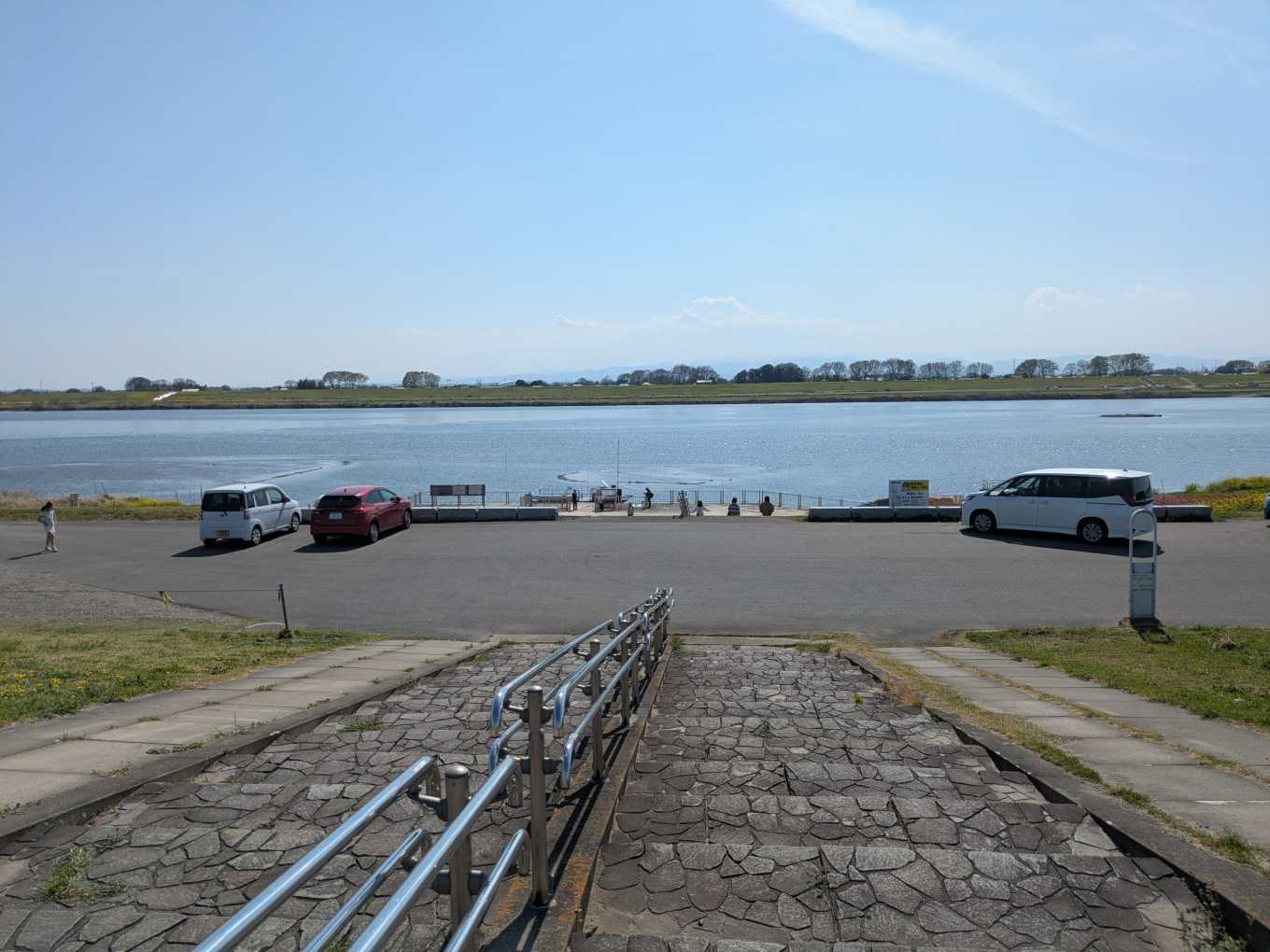 赤岩渡船場側の土手の上から見たところ。矢印のところが『赤岩ベース』です。