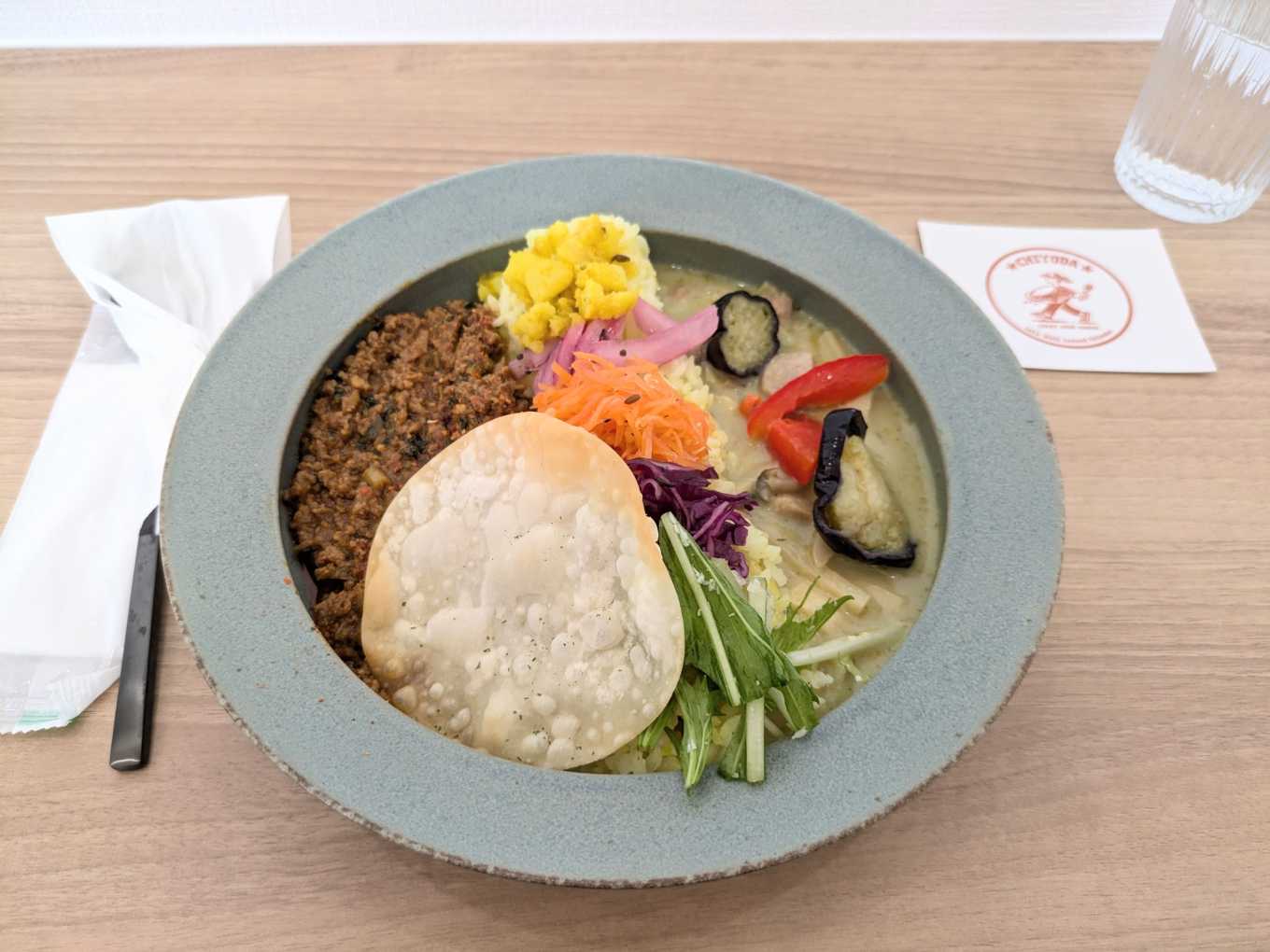 カレーは週替りで、今週は、バターチキンカレー(甘口)、グリーンカレー(辛口)、味噌キーマカレー(中辛)の3種類。