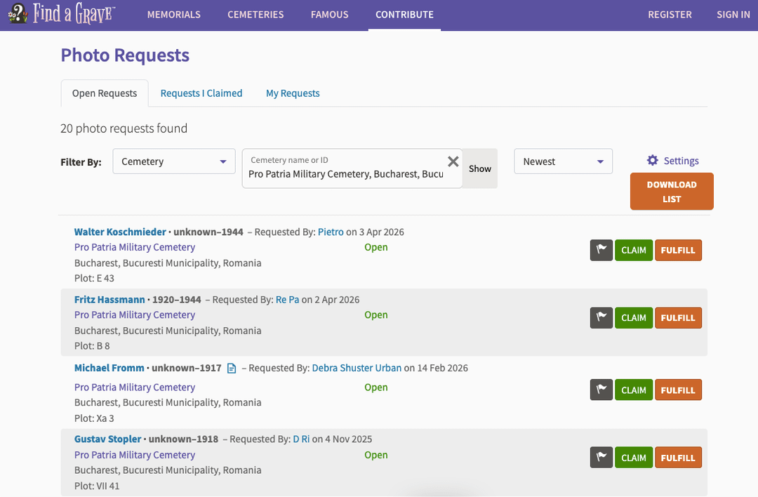 こんにちは、みんな。最近このプラットフォームを発見しました FindaGrave.com これは、二度の世界大戦中にルーマニアに駐留していたルーマニア国民または兵士の子孫が、親族の墓石の写真撮影のリクエストを提出するものです。数週間前、ここにいる誰かが福音ルーテル墓地にある妻の墓に直接行くことができないため、そこにある妻の墓を訪れるよう一般に呼びかけているという投稿を読みました。まあ、これらの人々でさえ、家族の過去を知るためにルーマニアに来ることはできません。私たちはカメラのレンズを拭いて、助けの手を差し伸べますか?あなたは何と言いますか