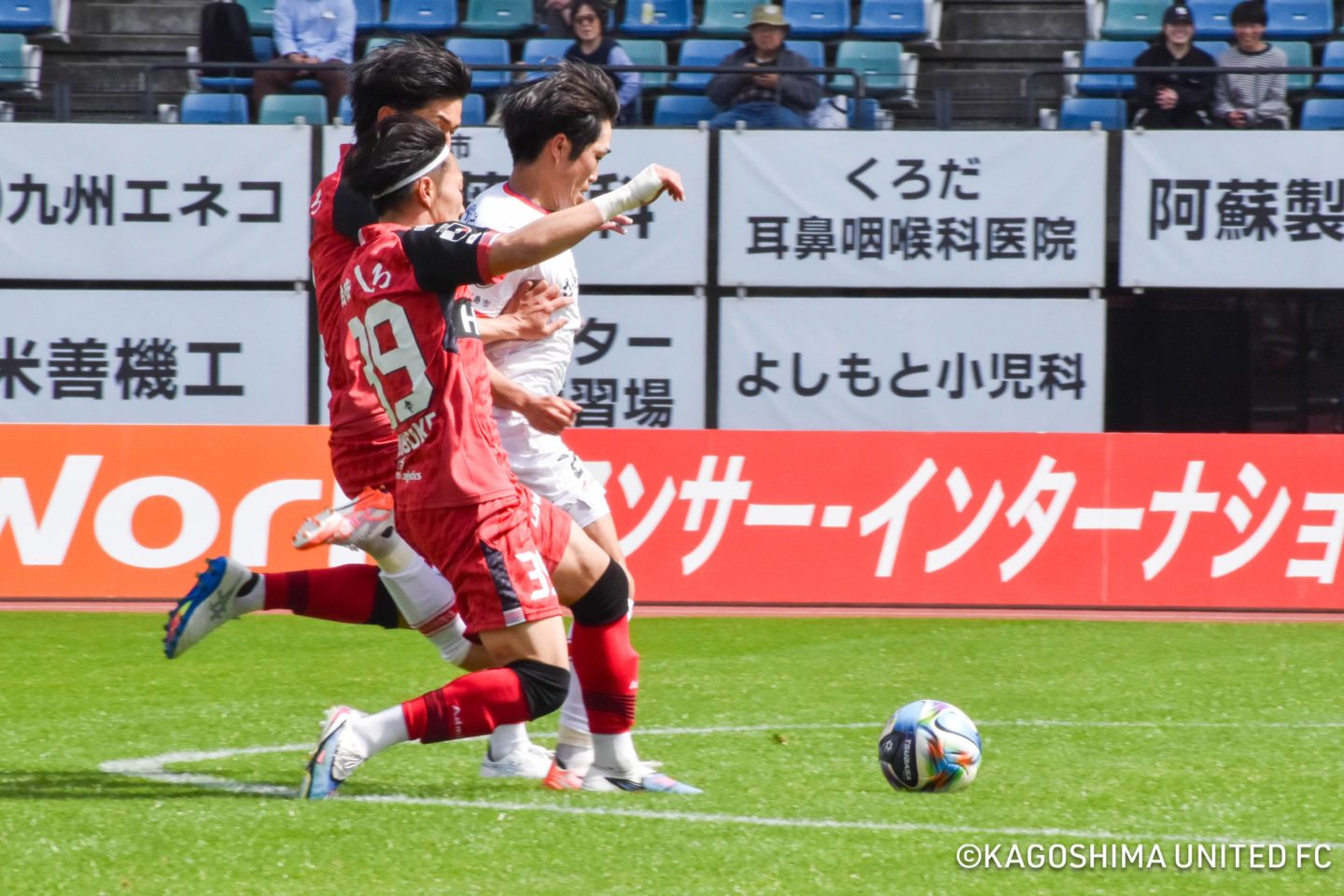 熊本のシュートは鹿児島の選手に当たり、あるいは枠を外れる。