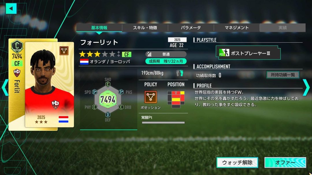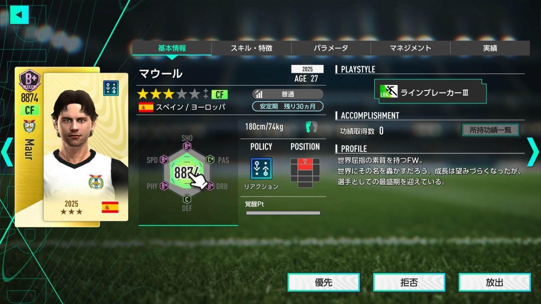 所属選手を見ると、中央からでもサイドからでも攻撃を展開できる分厚い選手層となっている。どのように攻めるかは監督の責任だ。選手やクラブの属性を意味する「ポリシー」は「リアクション」に統一したとしても、中央突破優先かサイド攻撃優先かを決めるのは監督の責務だといえるだろう。それらを決めることによって、自然とフォーメーションと、キーポジションに特定のプレイスタイルを有する選手を配置することでバフが受けられるフォーメーションコンボも決まってくる。