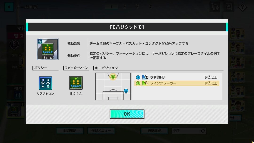 実は、スタメン総合力がさらに上がるフォーメーションコンボに心当たりがなかったわけではない。フォーメーションコンボには銅、銀、金の3種類が存在し、FCハリウッド’01が銀のフォーメーションコンボにあるのに対して、それより強いポリシーがリアクションのフォーメーションコンボも用意されている。金のフォーメーションコンボは各国のリーグ戦を優勝できるフォーメーションコインを消費しなければ入手できないため、手に入れる時間がかかる。しかし、スペインリーグ優勝やヨーロッパチャンピオンシップ優勝を果たすためには金のフォーメーションコンボは必要となってくるだろう。不本意な戦い方をするくらいなら、今回の試みが失敗になってもいい。いまの時点で私が用意できる戦術を注ぎ込んでクラブを最強にさせてみせる。そのような決意が固まった。