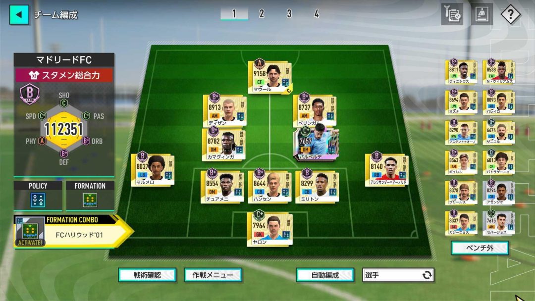 今回のマドリードFCでは、フォーメーションは5-4-1 Aを採用した。このフォーメーションは中盤の4人はDM2人とAM2人の中央突破を優先するものとなっており、LWのヴィニシウス・ジュニオールたちのポジションがなくなってしまうが、私は中央突破こそが優勝への近道だと感じていたのだ。フォーメーションコンボは、チーム全員のキープ力・パスカット・コンタクトが60%アップする「FCハリウッド’01」。とにかく中央突破で圧倒して、マドリードFCの力を見せつけるつもりでいた。ところが、そう上手くはいかなかった。マドリードFCは確かに中央突破に優秀な人材が揃っているかもしれないが、サイドにもそれに負けず劣らずの選手が所属している。本当にベストのメンバーを試合に送り出せているのかと自分の判断に疑心暗鬼になってしまったのも事実だ。