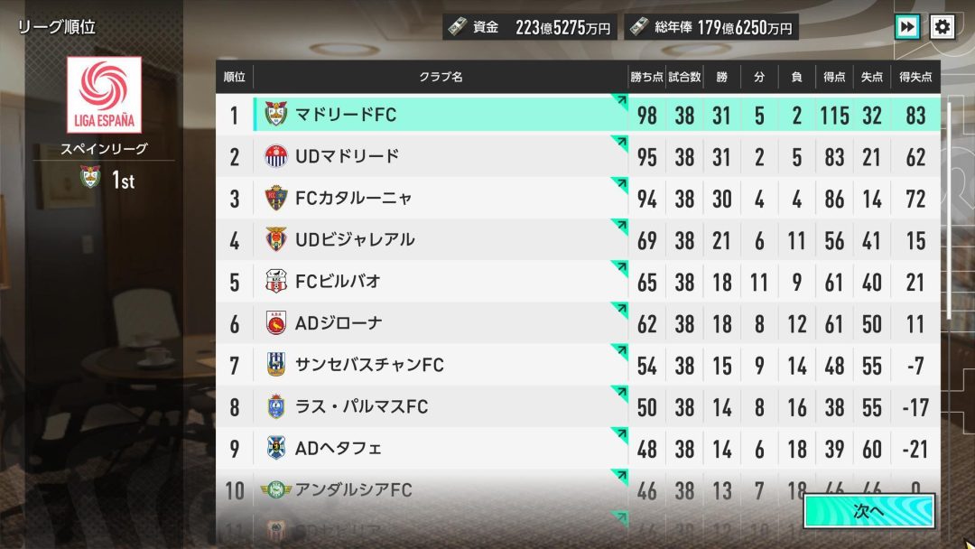 我がマドリードFCは38試合31勝5分2敗、勝ち点98で優勝したが、2位のUDマドリードは38試合31勝2分5敗で勝ち点95、3位のFCカタルーニャは38試合30勝4分4敗で勝ち点94とどこが勝ってもおかしくなかった。マドリードFCがゴーデンゾーネン’95を導入するのが遅れていたら優勝することはできなかっただろう。