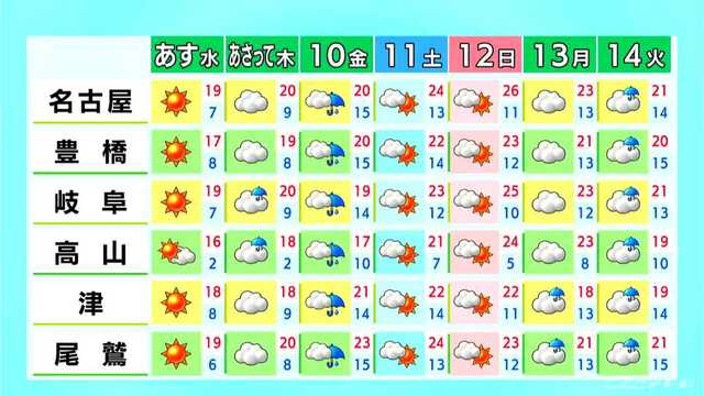 あさって木曜日は雲が広がり、金曜日は各地で雨が降るでしょう。週末は晴れ間が戻り、お出かけ日和になりそうです。日曜日は名古屋や岐阜で、最高気温が25℃以上の夏日になるでしょう。紫外線対策やこまめな水分補給を心がけましょう。