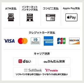 ATM払い/インターネット・モバイルバンキング払い/コンビニ払い/Apple Pay/クレジットカード払い/d払い/au PAY(auかんたん決済)/ソフトバンク・ワイモバイルまとめて支払い