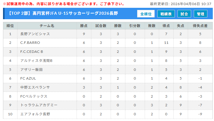 高円宮杯JFA U-15サッカーリーグ2026長野 TOPリーグ