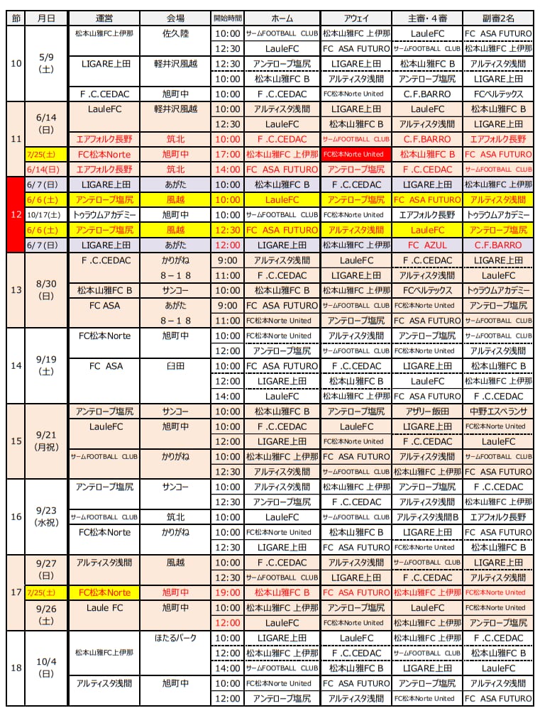 松本山雅FC上伊那、サームFC、FC 松本Norte United、F.C.CEDAC、LIGARE上田、アンテロープ塩尻、FC ASA FUTURO、LauleFC、アルティスタ浅間、松本山雅FC B