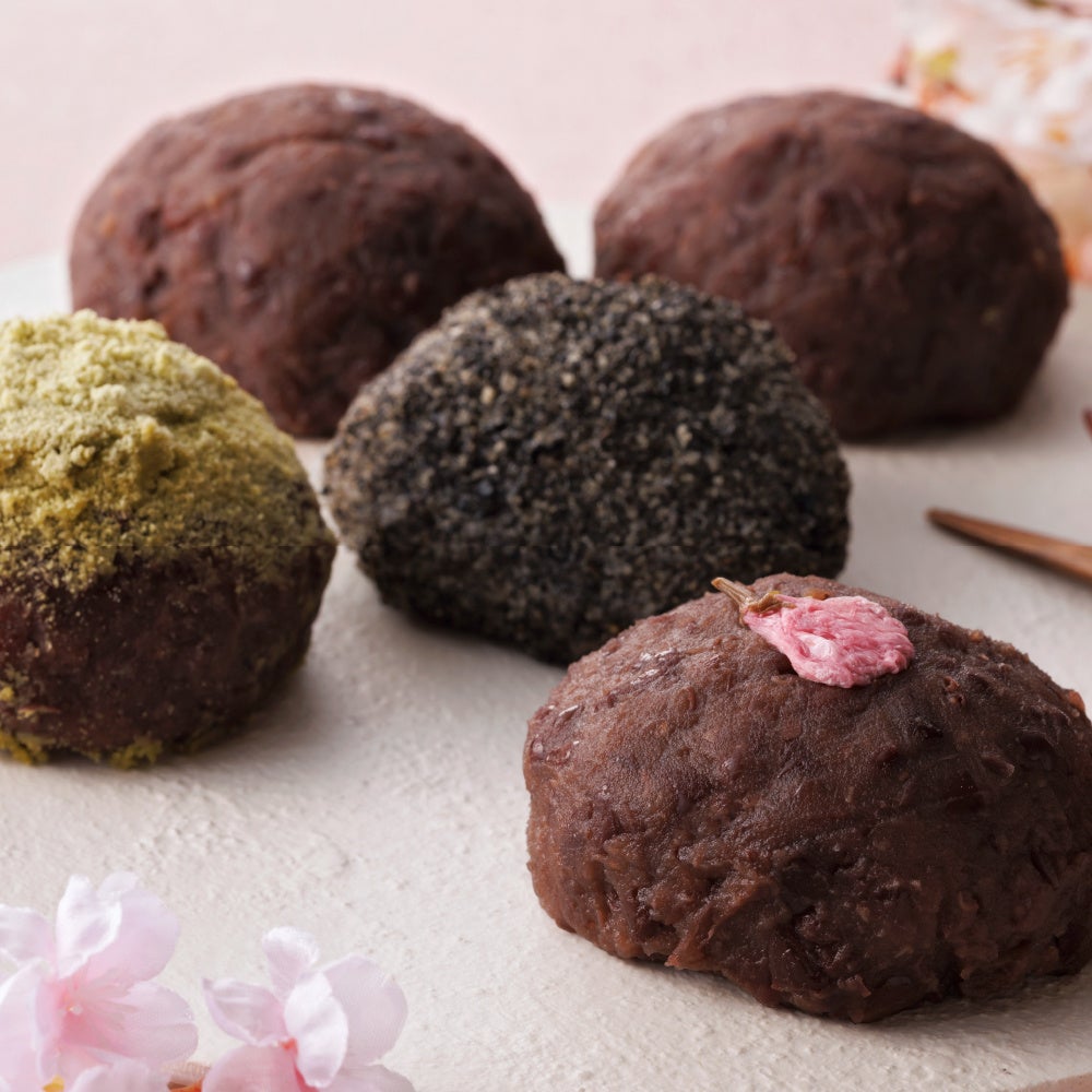 ①粒あんさくら、②粒あんきなこ、③ごま、④粒あんよもぎ、⑤粒あんおはぎ