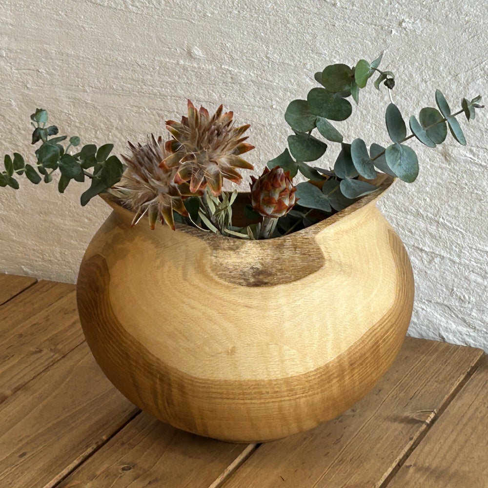 森林の町・道北下川町に住み、地域の材を活用して制作。木の個性を活かした、森のかけらのようなオブジェうつわ。中にガラスの容器を入れて花器としての利用も美しい。