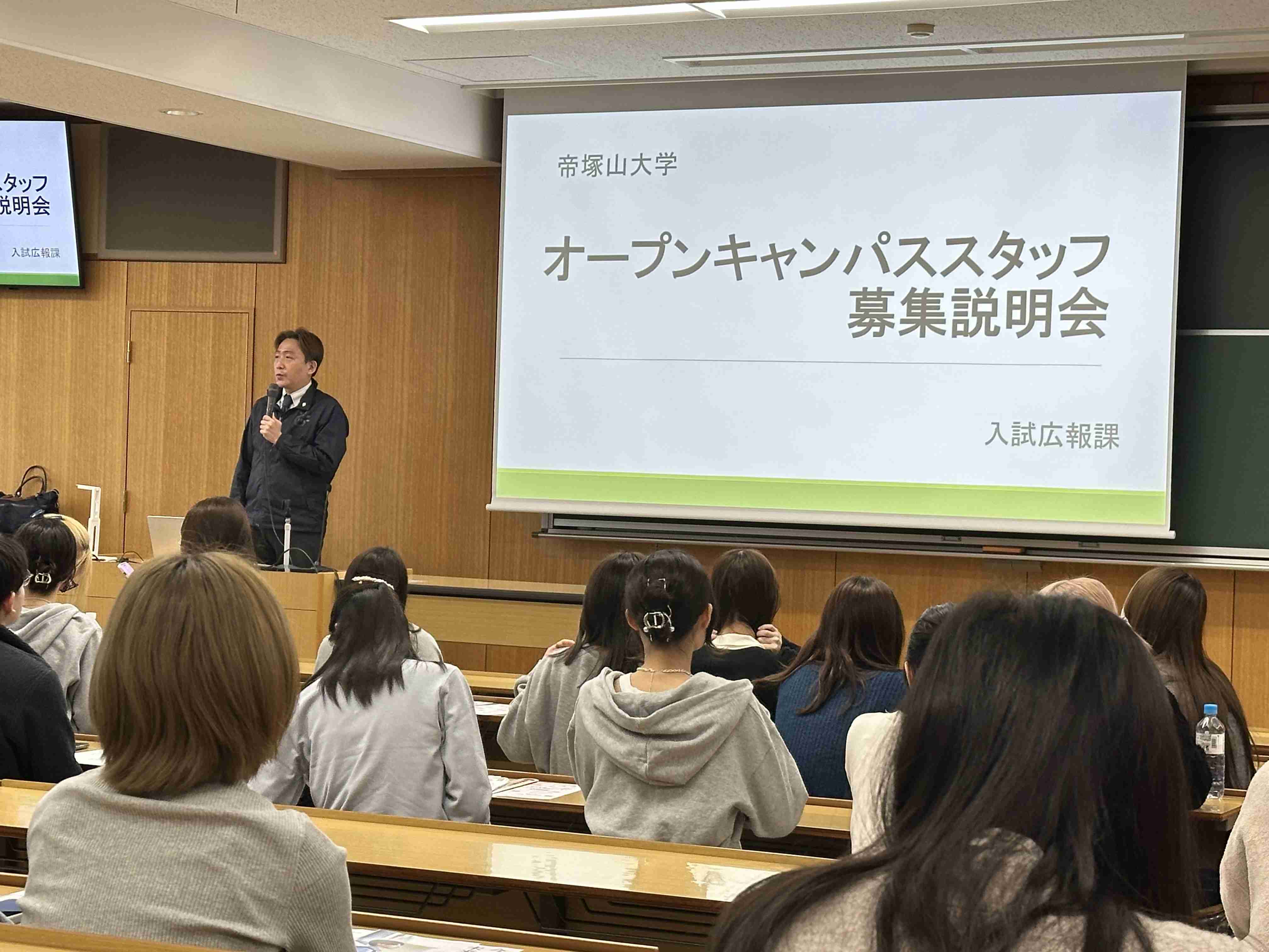 また、入試広報課によるオープンキャンパススタッフ募集説明会では、先輩学生が活動内容や他学部の学生との交流、学生生活が広がる魅力を紹介しました。