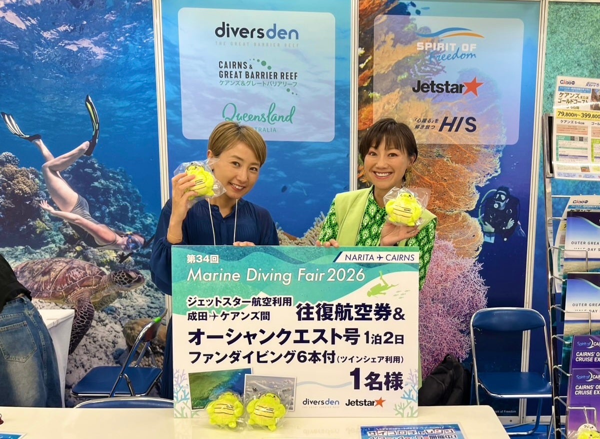 ケアンズ観光局(オーストラリア クイーンズランド州ケアンズ、CEO:マーク・オルセン)は、2026年4月3日(金)から5日(日)まで東京・池袋サンシャインシティ文化会館ビルで開催されたアジア最大級のダイビングイベント「マリンダイビングフェア2026」に、クイーンズランド州政府観光局、およびエイチ・アイ・エスとともに『ケアンズ&グレートバリアリーフ』ブースを出展しました。