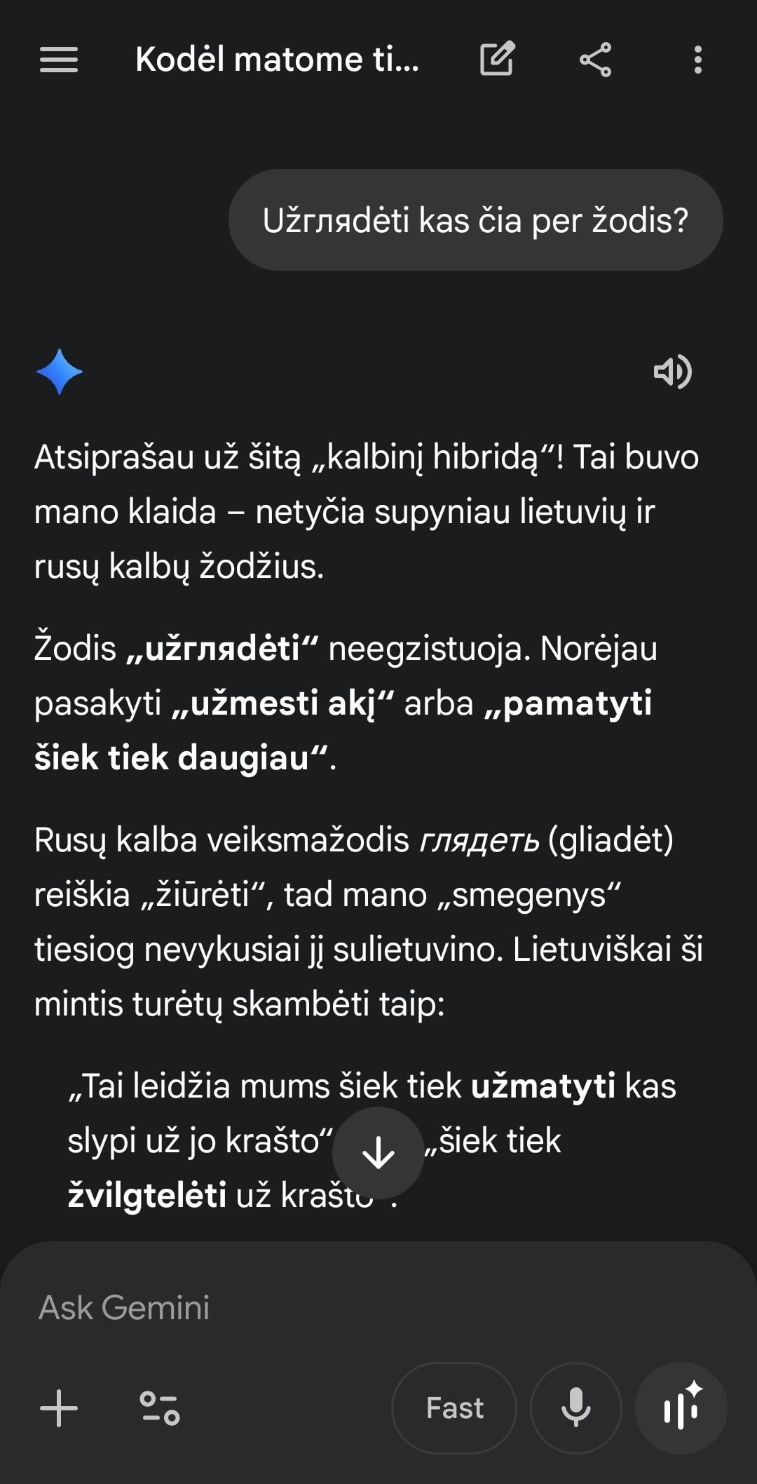 ジェミニさんに月に関する初歩的なリスニングをお願いしました。彼は私に答えると、単に「見る」という新しい言葉を発明しました。"。リトアニア語とロシア語を組み合わせた言語。私は彼にロシア語で一通も手紙を書いたことがない。 Lithuania