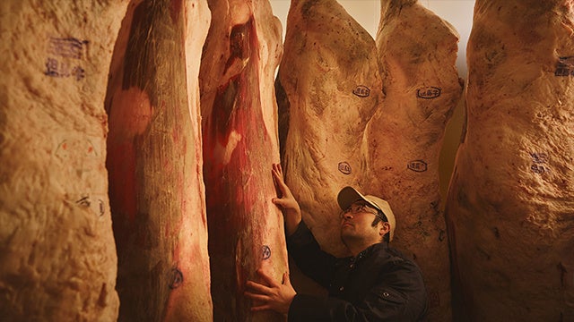 伏見にある熟成精肉店。明治後期より4代にわたり、牛と肉の目利きを積み重ね、信念をもつ農家の枝肉を徹底した管理のもと熟成。店内にショーケースを置かず、好みや用途に合わせた部位を目の前で切り出してくれます。