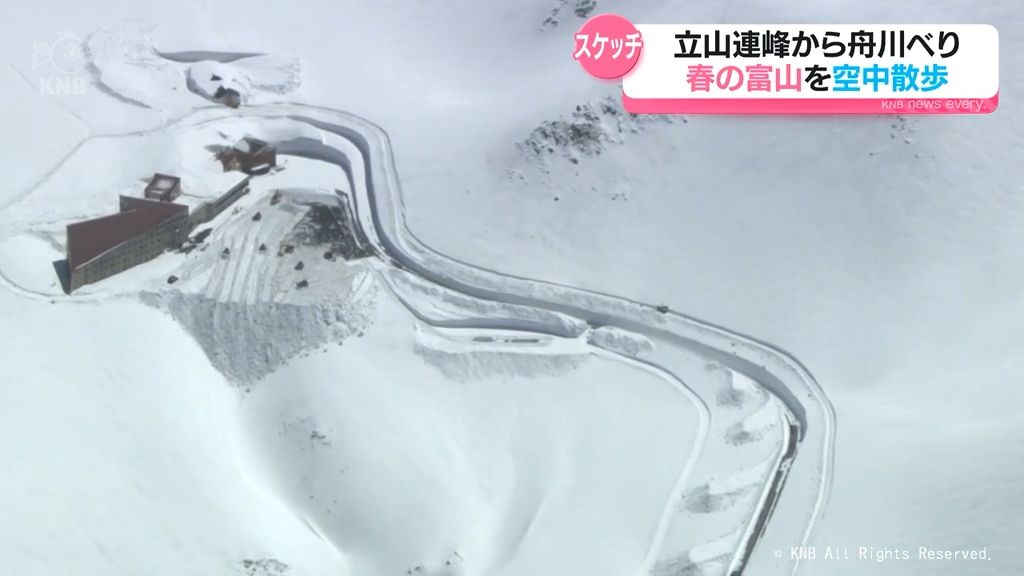 「1週間後に全線開通を控えている立山黒部アルペンルートの上空に来ています。一面真っ白の雪に一本の道が出来上がっています。立山アルペンルートにまもなく春の訪れです」