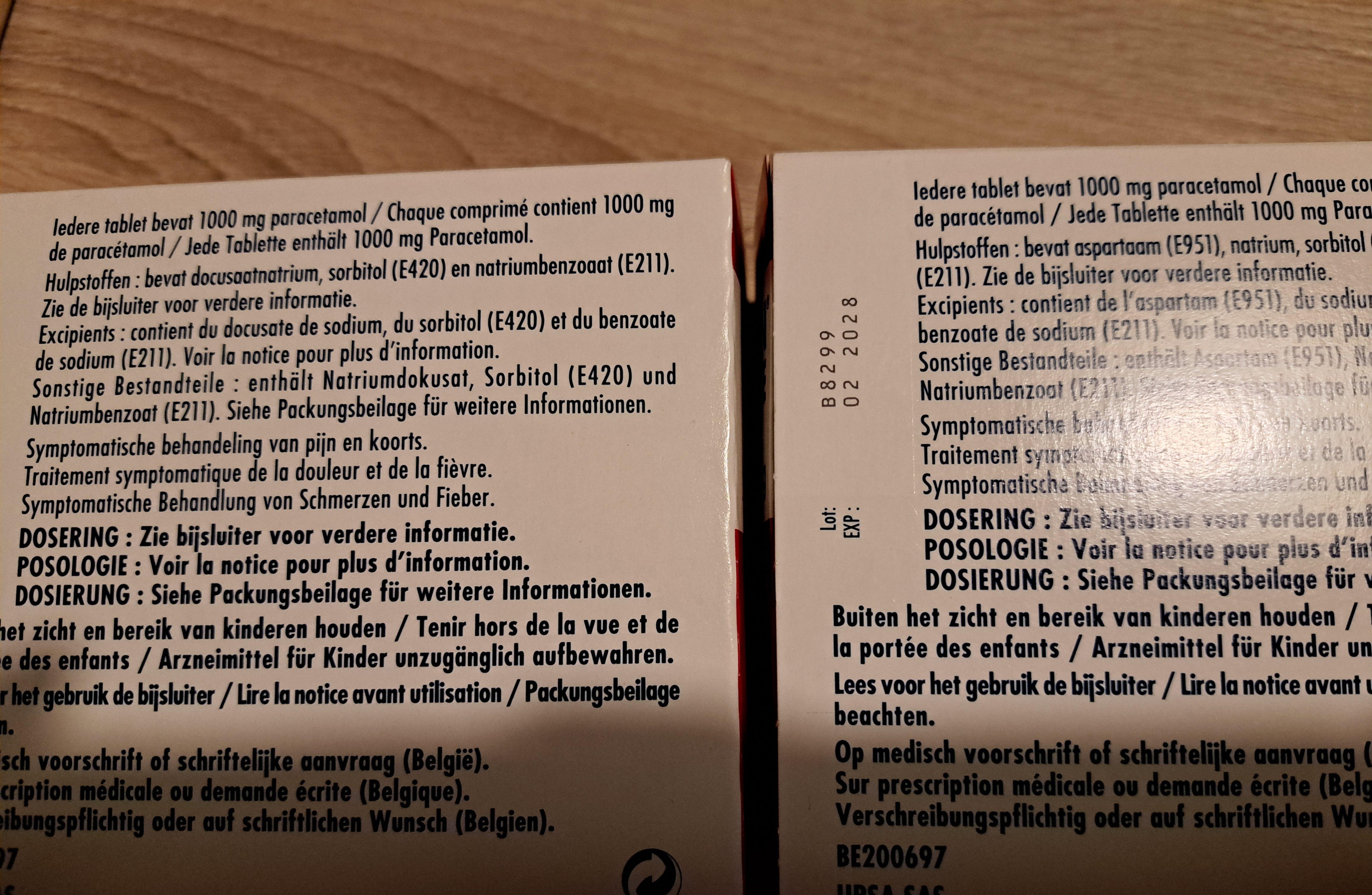 ちょっと奇妙な質問です。首の痛みに苦しんでいます。昨日ダファルガンを飲みました。ダファルガンのいつもの味と同じように。 今朝、新しい箱からもう一つ取り出しました。そしてすぐに味が悪いことに気づきました。気持ち悪い。箱を見ると、アスパルテームが吐き出され(これはジャンクであり、非常に理解できます)、ドキュサートナトリウムと呼ばれるものに置き換えられていることがわかります。 調べてみると、これは…下剤?何?医学知識のある方でこれを説明できる方いらっしゃいますか? Belgium