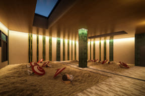 砂むし温泉施設「霧砂」。砂の圧力と温熱効果で大量の汗をかきリフレッシュできる