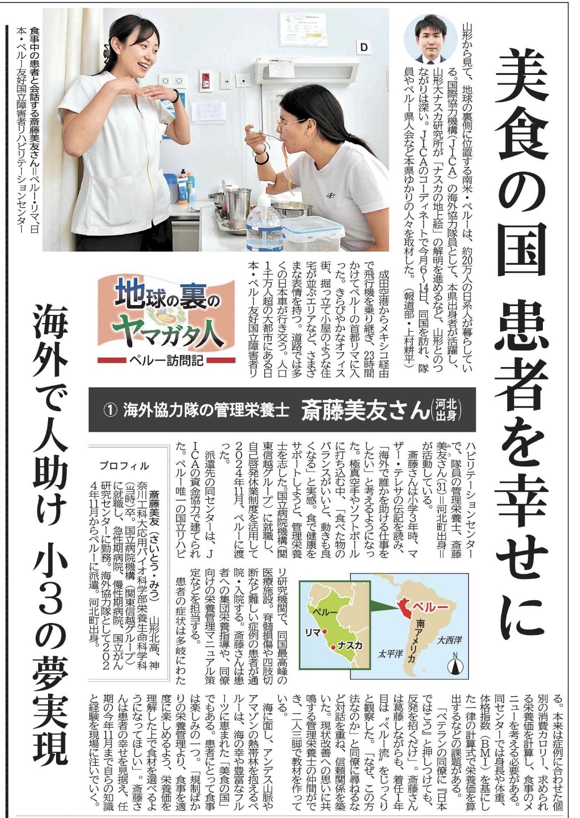 「地球の裏のヤマガタ人~ペルー訪問記」 美食の国 患者を幸せに ①海外協力隊の管理栄養士 齋藤美友さん(河北出身)