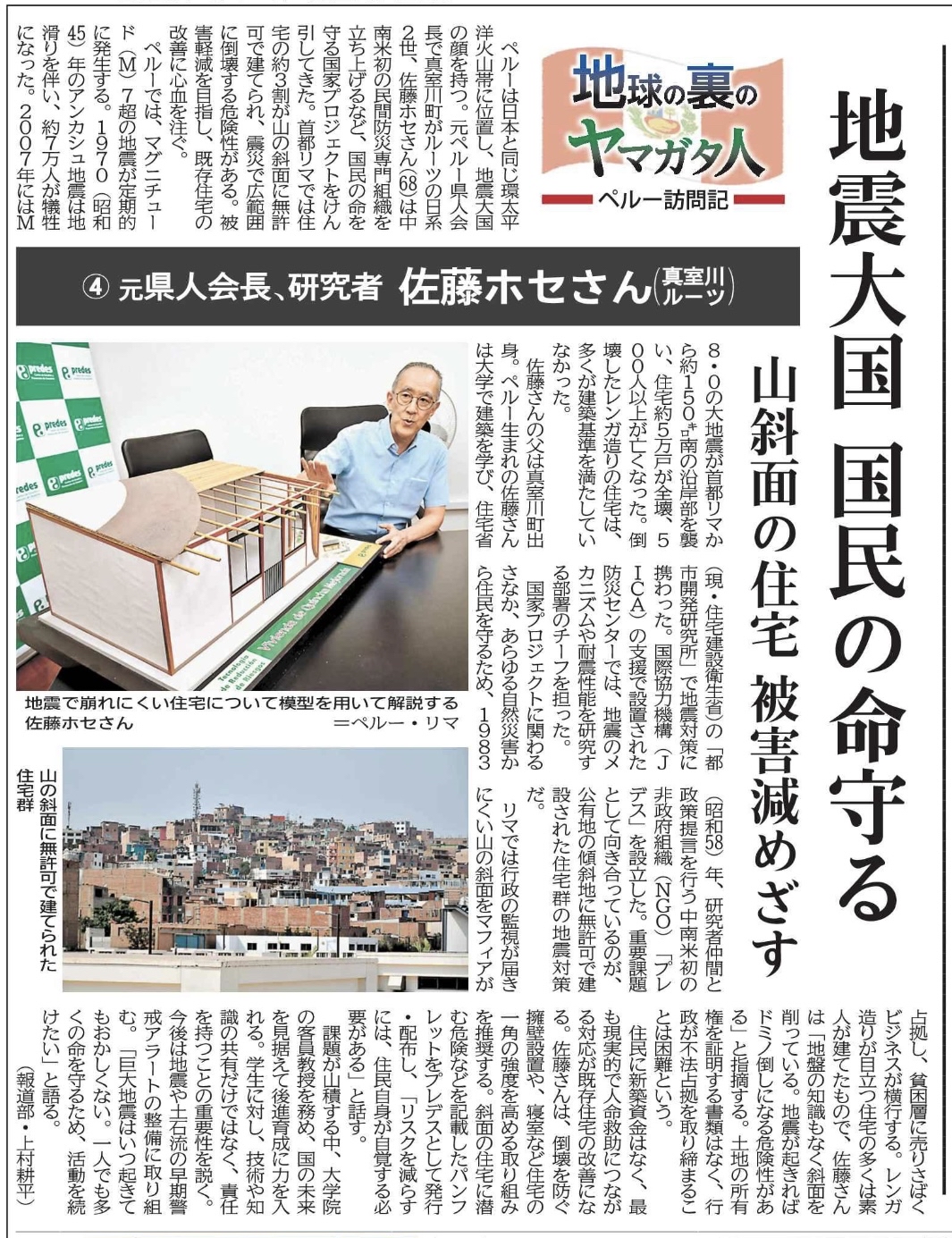 「地球の裏のヤマガタ人~ペルー訪問記」 地震大国 国民の命守る ④元県人会長、研究者 佐藤ホセさん(真室川ルーツ)