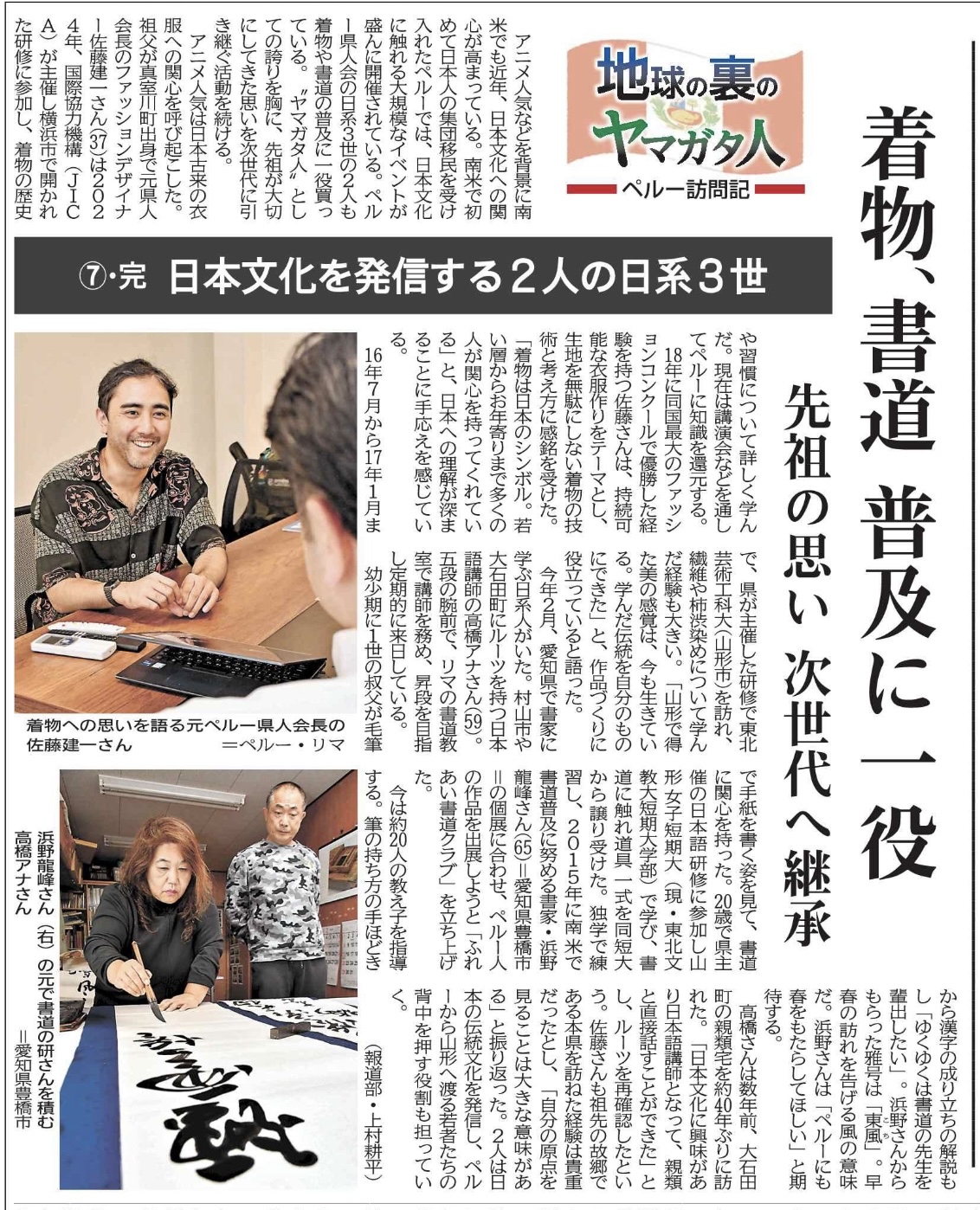 「地球の裏のヤマガタ人~ペルー訪問記」 着物、書道 普及に一役 ⑦・完 日本文化を発信する2人の日系3世