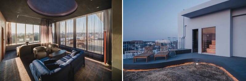 左から、スイートルーム、ルーフトップバルコニーとサウナ