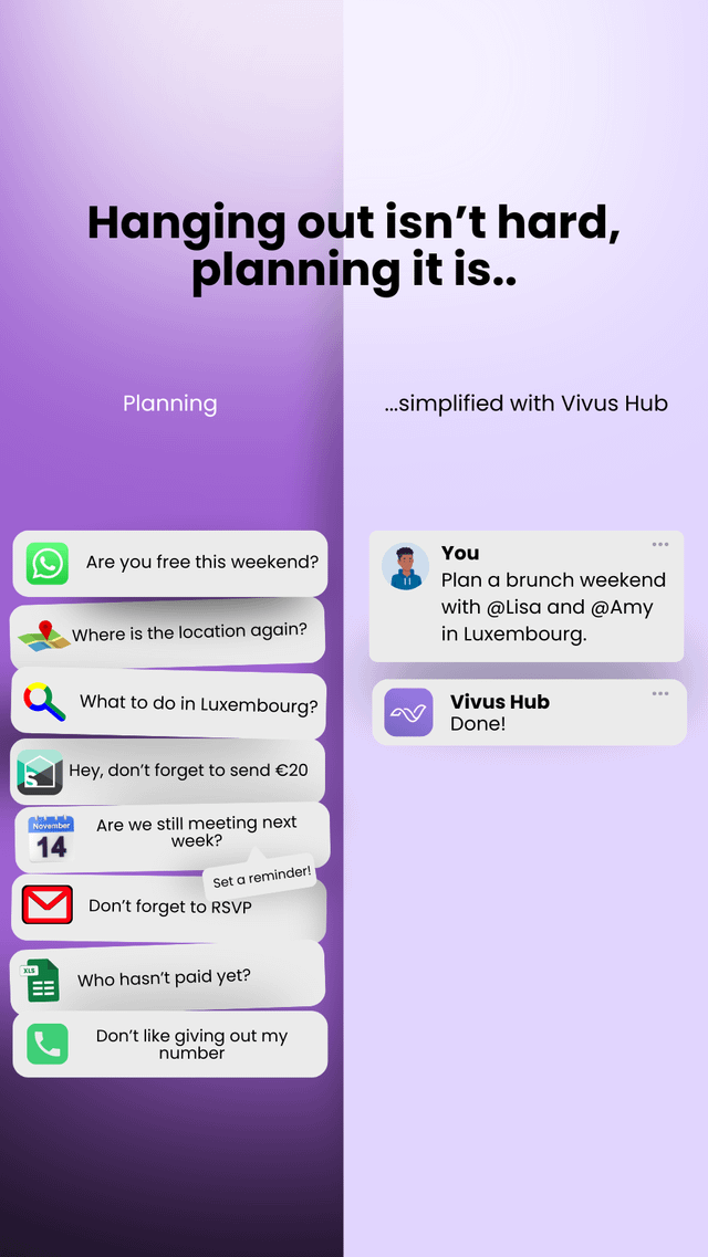 ロジスティクスがすでに処理されている小規模なハングアウトに参加または作成できます:(招待、リマインダー、費用の分割など)。