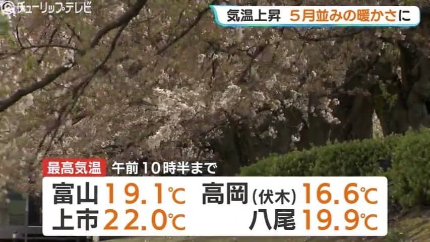 このため気温も上昇し、午前10時半までの最高気温は富山で19.1℃、高岡市伏木で16.6℃、上市で22℃となっています。