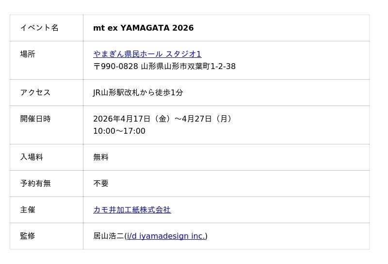 文具・雑貨向けマスキングテープ”mt masking tape”を製造するカモ井加工紙株式会社(本社:岡山県倉敷市)は、山形市・やまぎん県民ホールにて、mtの大型イベント「mt ex展」を開催いたします。