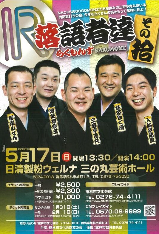群馬県館林市で毎年開かれている人気の催し「落語者達(らくもんず)その十」が5月17日、館林市の日清製粉ウェルナ三の丸芸術ホールで開かれます。