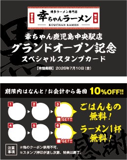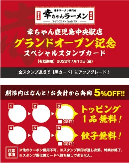 「幸ちゃんラーメン 鹿児島中央駅店」のオープンを記念し、先着3,000名様限定で、使えば使うほどお得になる「グランドオープン記念スペシャルスタンプ(赤)カード」を配布いたします。