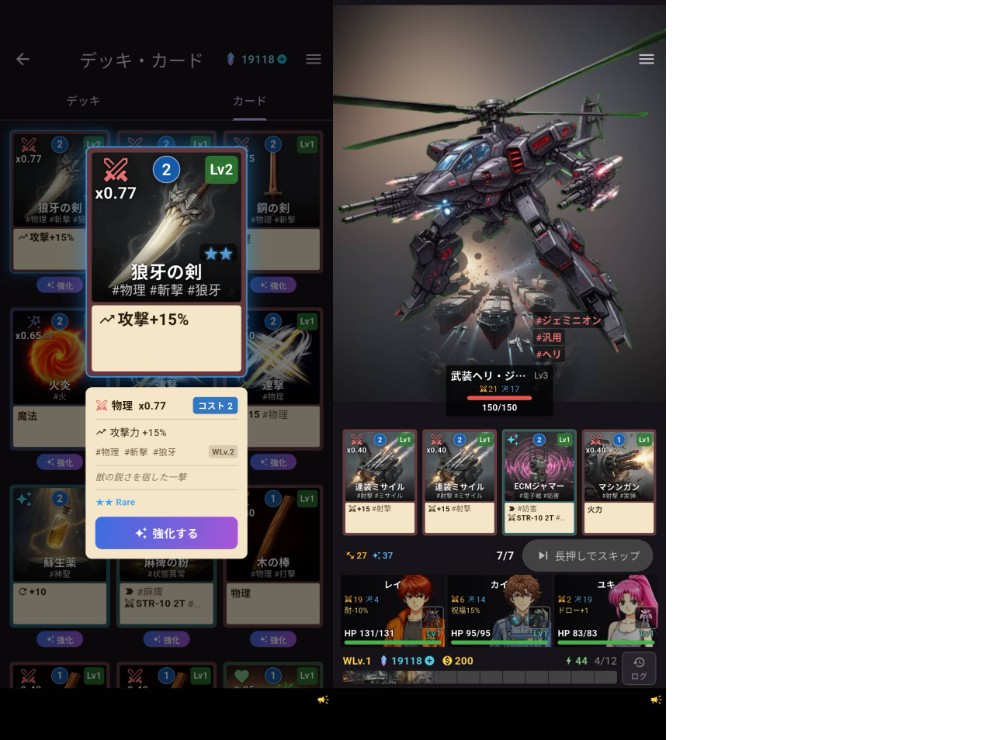 戦闘には奥深いカードバトルを採用した。イラスト生成に留まらず、ユーザーが入力するプロンプトや獲得素材に応じて、カードの「性能」そのものをAIが自動生成する。自分の想像力が戦力に直結する、かつてないビルド体験を実現した。