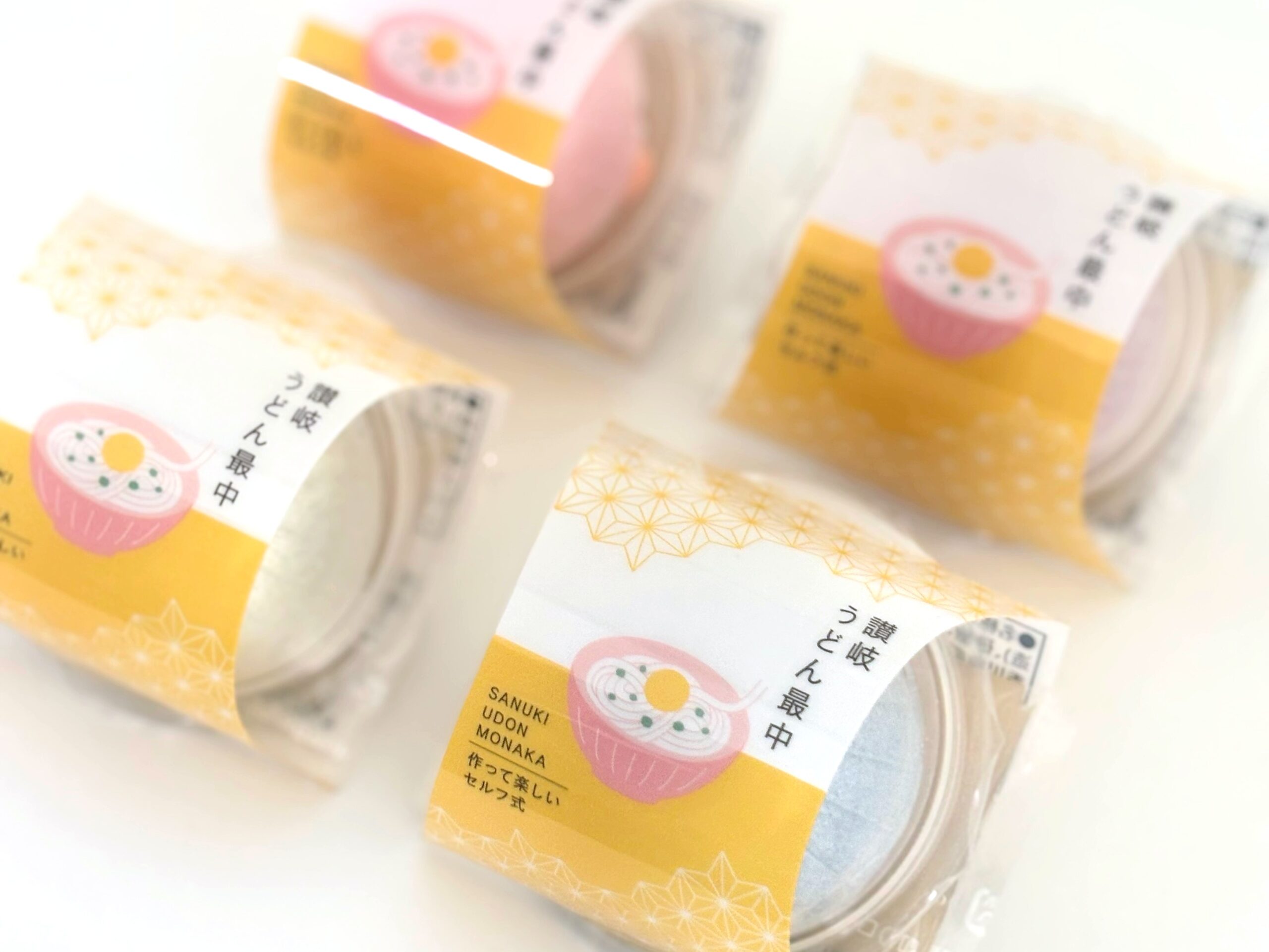 伝統×モダンのデザイン: 香川の伝統菓子「おいり」をトッピングし、パッケージには伝統工芸の「組手障子」や「水引」をモチーフにした洗練されたアートを採用。