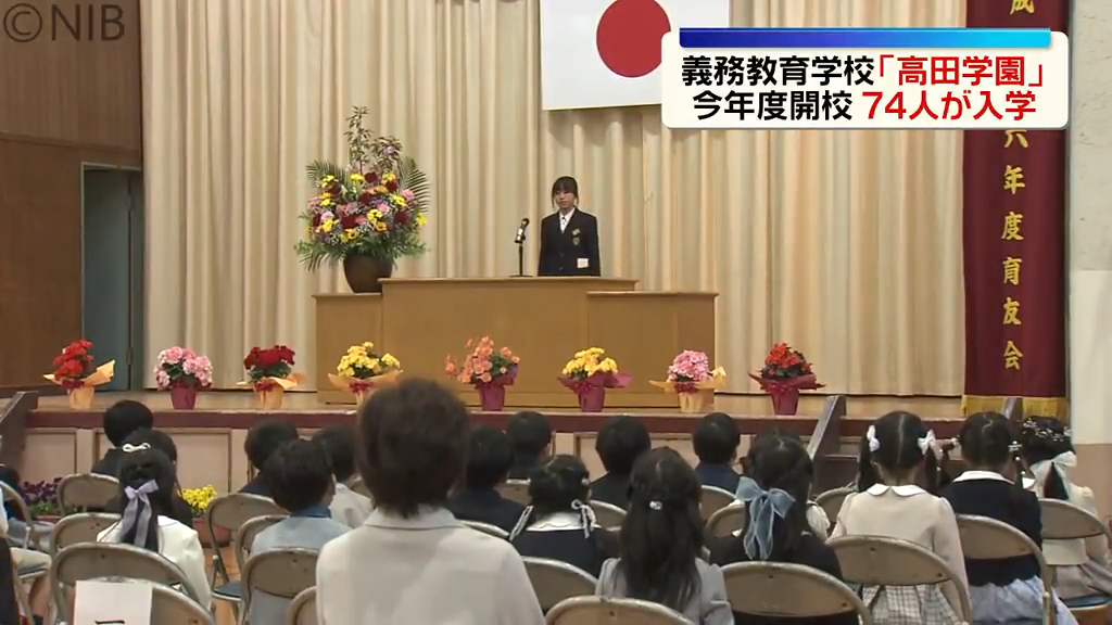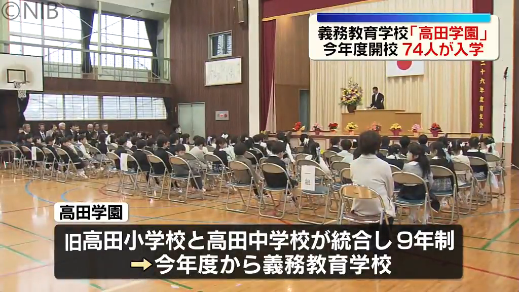 高田学園として初めて迎える入学式で、髙比良 尚校長は「たくさん笑ってたくさん学んで 9年間を素晴しいものにしましょう」とあいさつしたほか、児童・生徒の代表が歓迎しました。