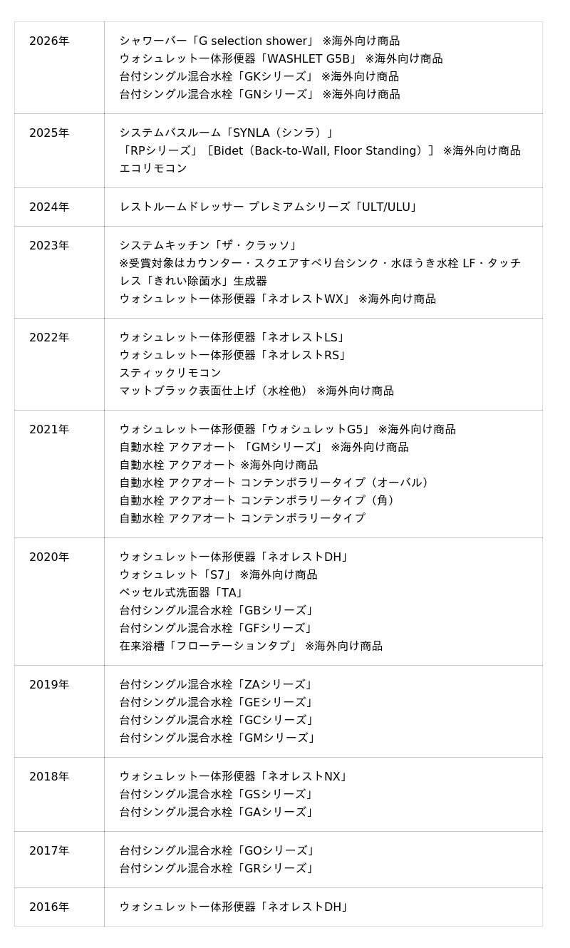 「レッドドットデザイン賞」は、1955年から続く国際的に権威のあるデザイン賞で、ドイツ・エッセンに本拠を置く「ノルトライン・ヴェストファーレンデザインセンター」が主催しています。著名なデザイン専門家による革新性、機能性、品質などの基準に沿った厳正な審査の結果、プロダクトデザイン部門において、「G selection shower」、「WASHLET G5B」、「GKシリーズ」、「GNシリーズ」の4点が高く評価されました。