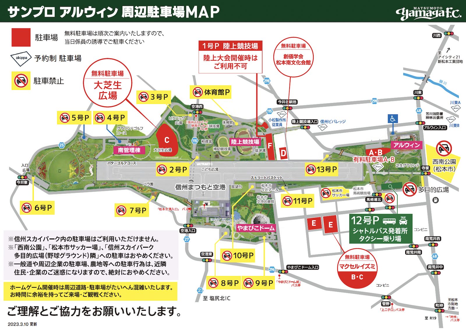 駐車場開場時間収容台数<C>大芝生駐車場9:00約2,000台<D>創価学会様 松本南文化会館駐車場9:30約200台<E>マクセルイズミ株式会社様 B・C駐車場9:30約250台<F>陸上競技場駐車場<D>満車次第開場当日の利用状況により変動