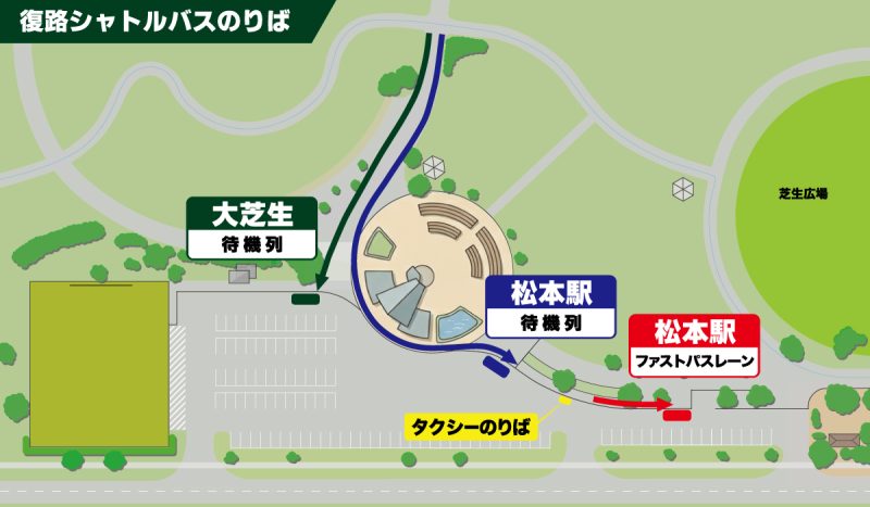 復路シャトルバスの1巡目が通常、試合終了後約30分程度で全て松本駅に向かって発車しています。ファストパスをお持ちの方も1巡目に間に合わなかった場合、次便が戻ってくるまで(約30分程度)お待ちいただきます。乗車可能な場合の優先乗車となりますので、ご注意ください。次便が戻り次第、優先的にご案内いたします。